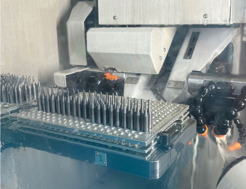 Our company produces dental milling burs using advanced six axis WALTER grinding machines from Germany. The base material used is high-quality European 0.2 μ, 0.4u ultra fine particle tungsten steel bars, which have ultra-high rigidity and strong wear resistance, providing strong protection for the service life of the milling tools; The coating technology used at the same time is Switzerland's most advanced coating technology, which reduces the hardness, durability, and friction coefficient of the cutting tool to 0.05-0.1 during cutting use. The adhesion of the coating is stronger, and its performance is more than 10 times higher than that of dental milling tools produced in the same industry.